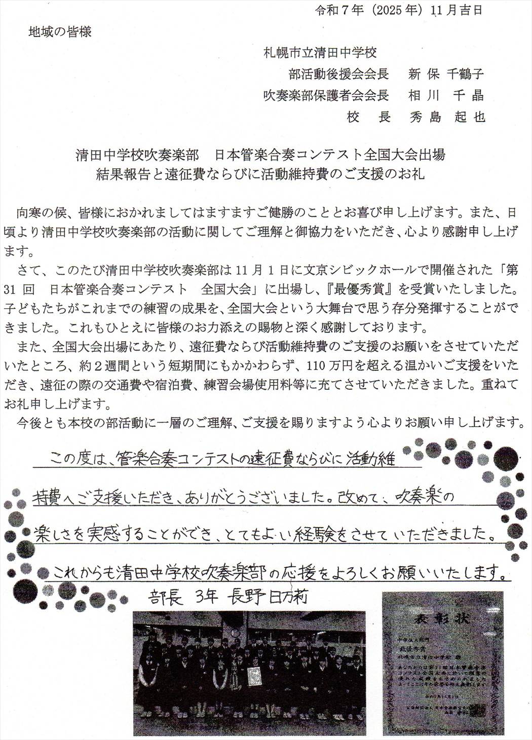清田中学校吹奏楽部 日本管楽器合奏コンテスト全国大会出場結果報告と遠征費並びに活動維持費の支援のお礼