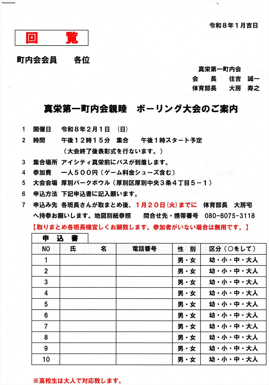回覧 真栄第一町内会親ぼくボーリング大会のご案内